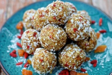 Makes 12 large balls, 24 mini bites Ingredients: 100g nuts (walnuts/almonds/cashews) 100g desiccated coconut 50g goji berries 50g rolled oats 100g dried apricots 2 tbsp honey Pinch of salt Methods: First, gently toast the nuts […]